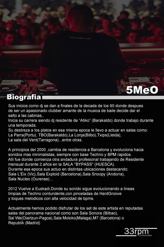 La larga carrera de 5MeO le ha brindado una amplia experiencia y un profundo conocimiento de la escena musical. Su influencia del EBM (Electronic Body Music), un género conocido por su ritmo duro y sonidos industriales, se hace evidente en sus sets, donde incorpora elementos oscuros y pulsantes para crear una experiencia inmersiva.