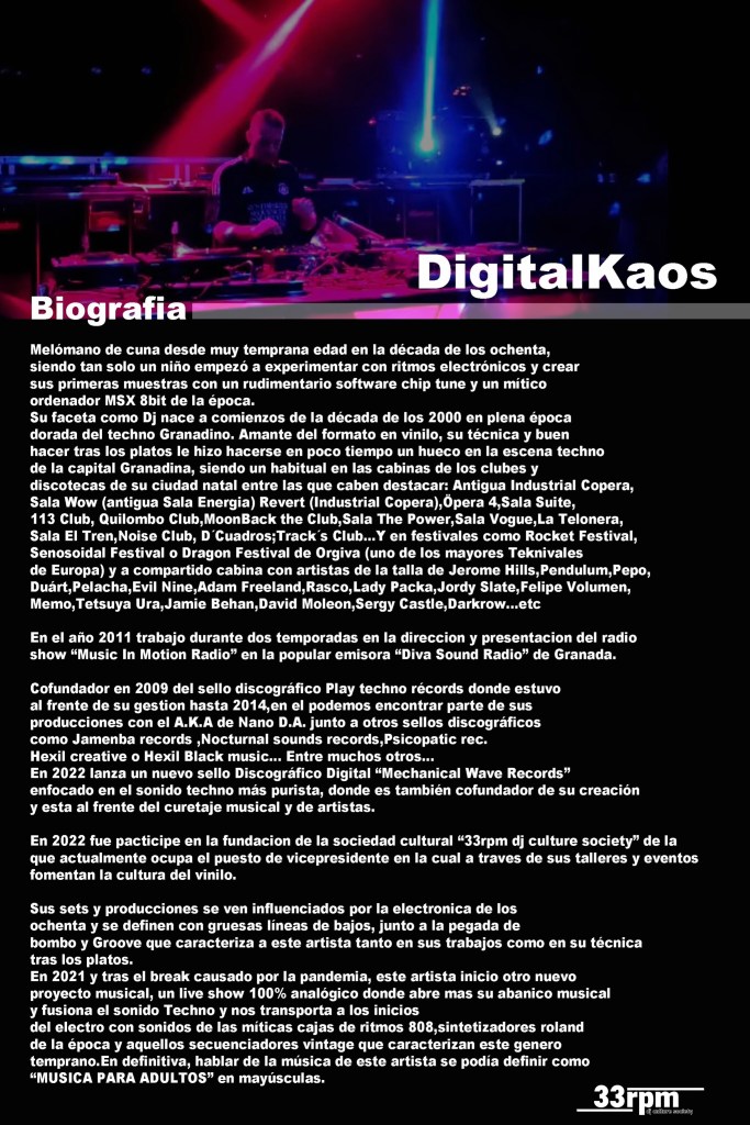 Además de su trabajo en el sello, DigitalKaos es una pieza clave y componente destacado del colectivo 33rpm DJ Culture Society. Con esta asociación de DJs y amantes de la música comparte la pasión por los vinilos y busca promover el valor artístico de pinchar con discos de vinilo en una escena cada vez más digitalizada. Su devoción por los vinilos le ha hecho que se gane un gran respeto en la escena underground, donde se valora su magistral técnica y su capacidad para crear una experiencia única en cada actuación.